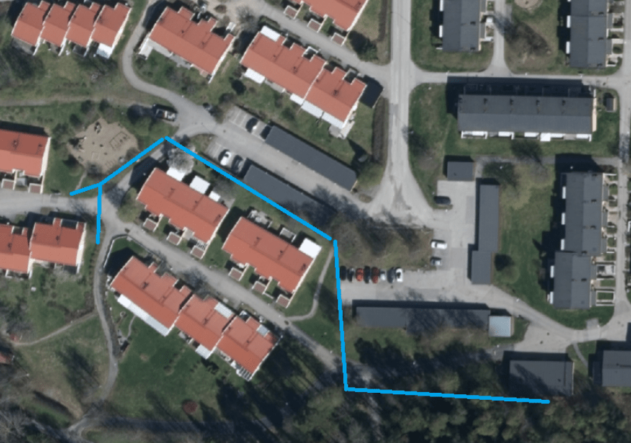 Blå linje gäller ny optokabel mellan Brf Norrskenet och Brf Tegelbacken