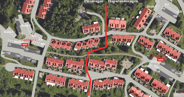 Laddarna är placerade på baksida garage G2 Piteåvägen samt vid parkeringen garage G7 Haparandavägen mitt i området. Se ritning